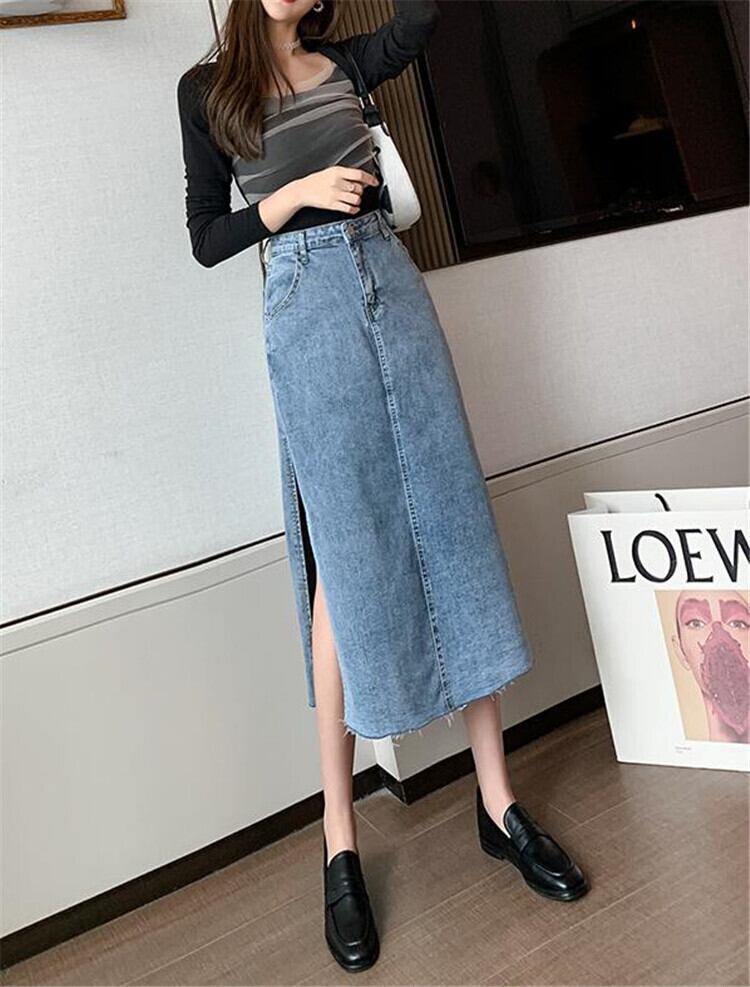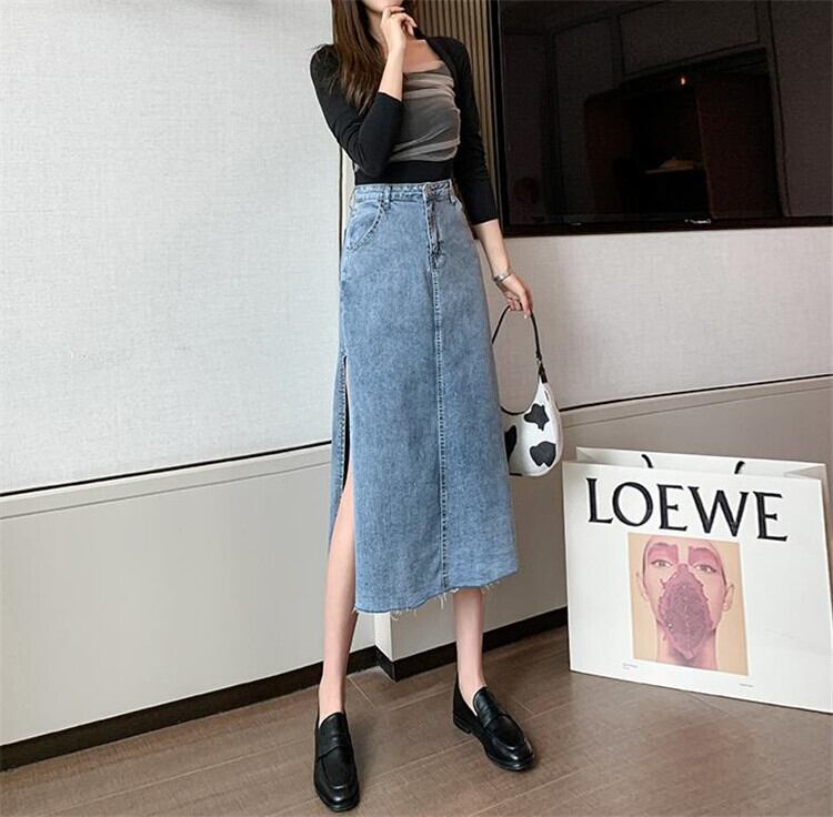 中・長セクション デニムスカート ハイウエスト ギャザリング