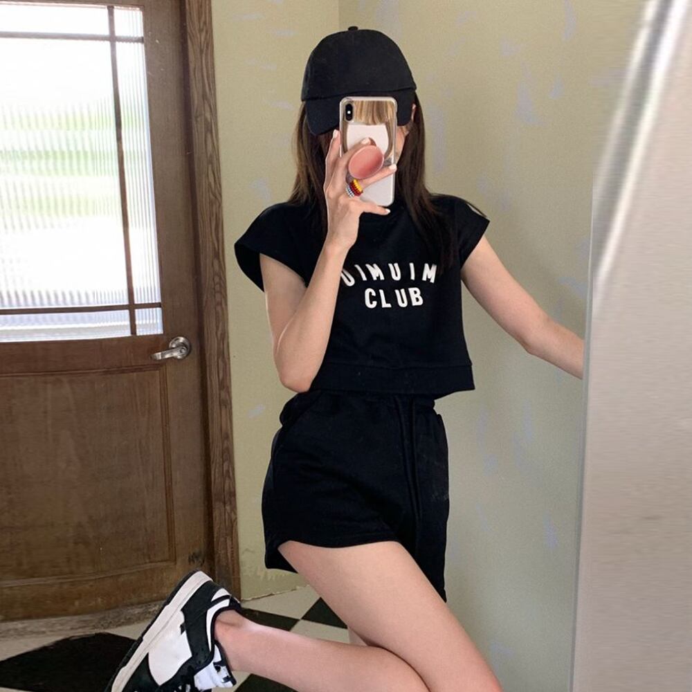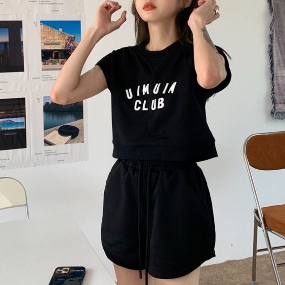 フレンチ袖 ショート丈トップス ウエストゴム ショートパンツ カジュアル上下セット 体型カバー2点セット スポーツウェア