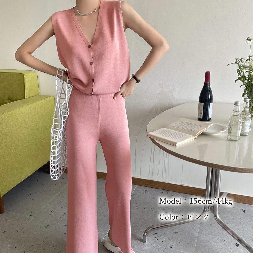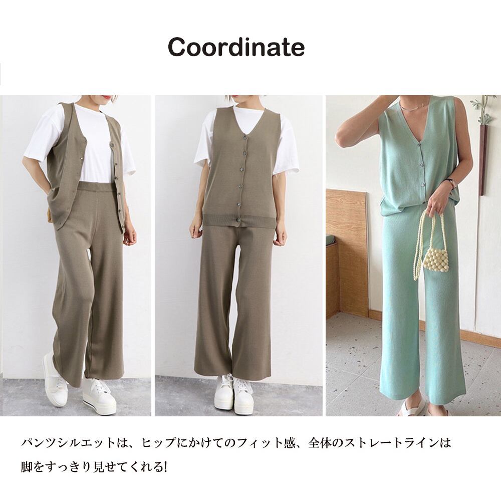 レディース 2点ニットセット オフィスカジュアル セットアップ ノースリーブ ベスト 体型カバー ワイドパンツ きれいめ