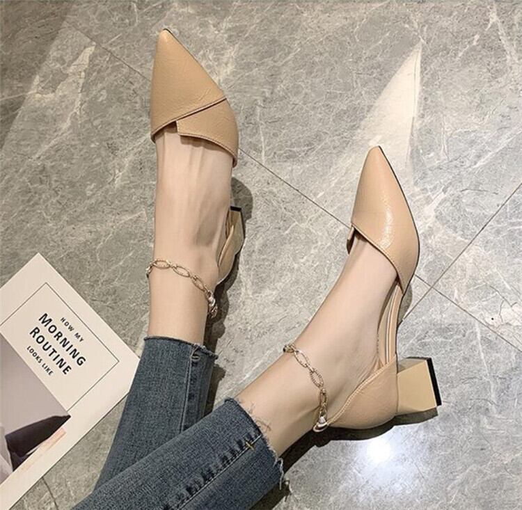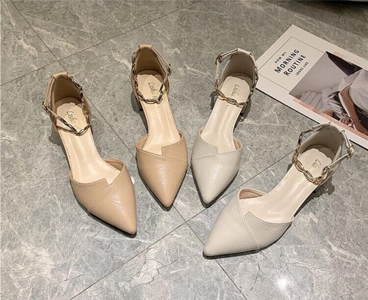 包頭 サンダル 厚手のヒール 百掛け 一字型ボタン ポインテッドトゥ