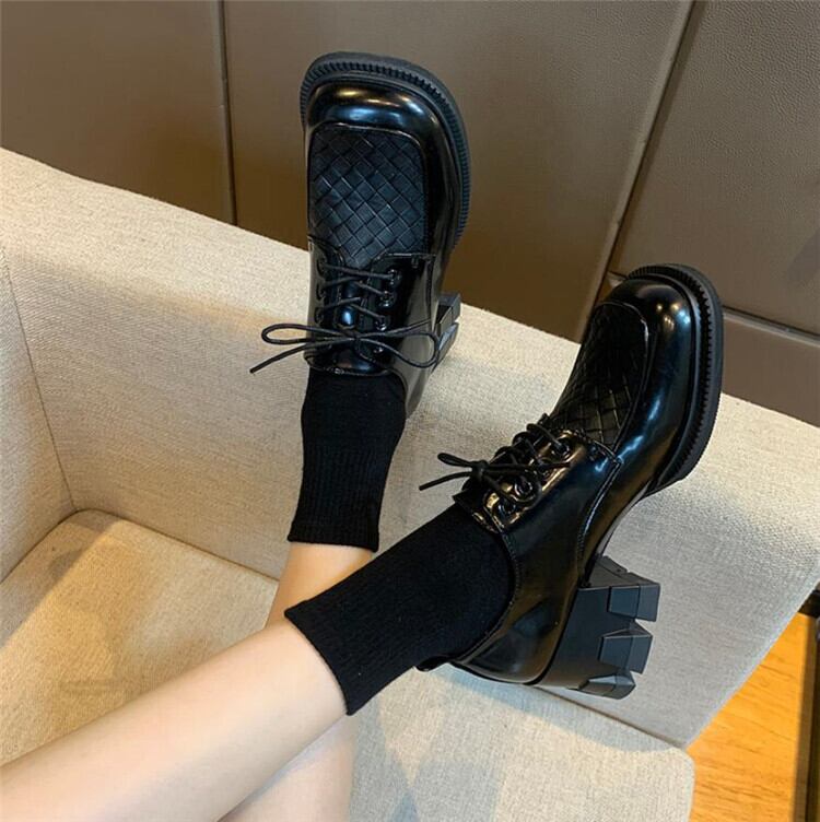 1枚でオシャレ見えが叶う新品 スクエアトゥ バンディング 太いヒール 小さな革の靴 スリップ 個性百掛け
