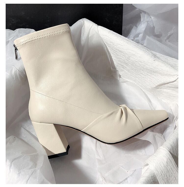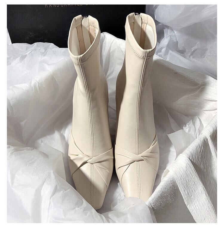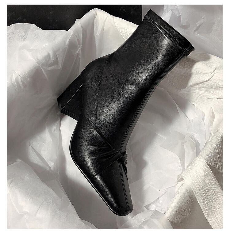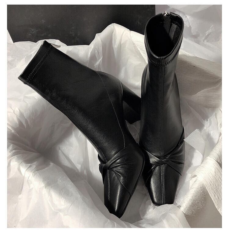 韓国版 気質 レトロ 蝶結び 太いヒール ショートブーツ スクエアヘッド スリップ 百掛け おしゃれな